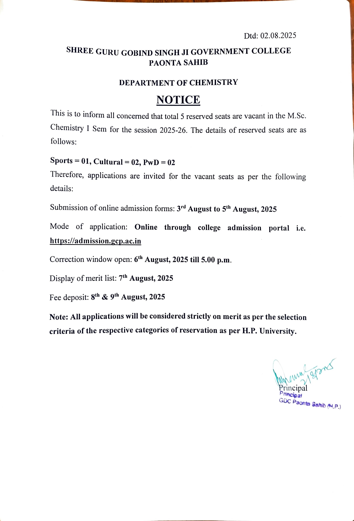 • Annual UG practical examination datesheet in the subject of Chemistry Session 2025-26
