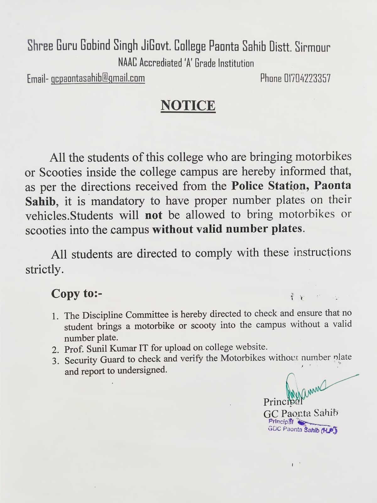 • Notice regarding bringing of Motorbikes or Scooties inside the college campus